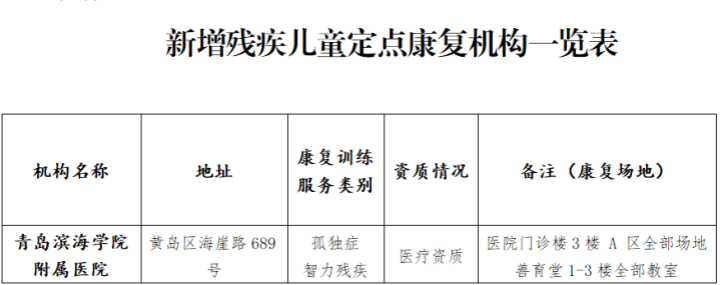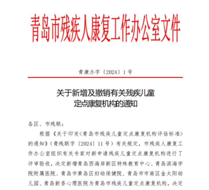 近日,青岛市残疾人康复工作办公室发布了《关于新增及撤销有关残疾儿童定点康复机构的通知》,青岛滨海学院附属医院获批为青岛市残疾儿童定点康复机构,康复场地设在医院门诊楼及青岛滨海学院特教中心善育堂。