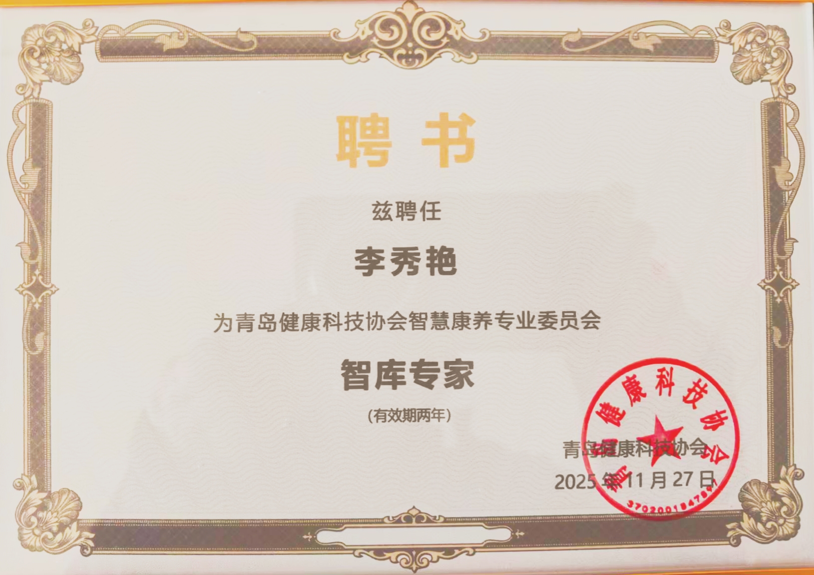 11月27日,青岛健康科技协会智慧康养专业委员会智库成立大会在汇智园召开。大会聚焦康养产业高质量发展需求,正式组建专业智库平台。青岛滨海学院李秀艳教授成功当选智库首批专家。