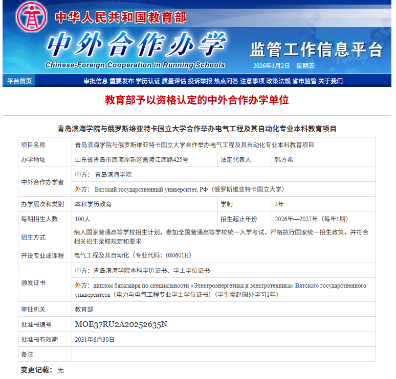 2025年12月31日,经教育部批准,青岛滨海学院与俄罗斯维亚特卡国立大学合作举办的电气工程及其自动化专业本科教育项目正式获批,将于2026年秋季学期启动招生。这是青岛滨海学院首个中外合作办学项目。