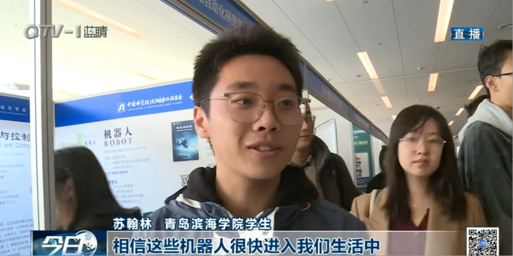 学校信息工程学院苏翰林同学在展览会中接受了青岛电视台采访,他说:“动作捕捉的机器人,可以跟人做同步动作,感觉现在科技发展得非常快,相信这些机器人很快将进入我们生活中,给人们提供便利。”
