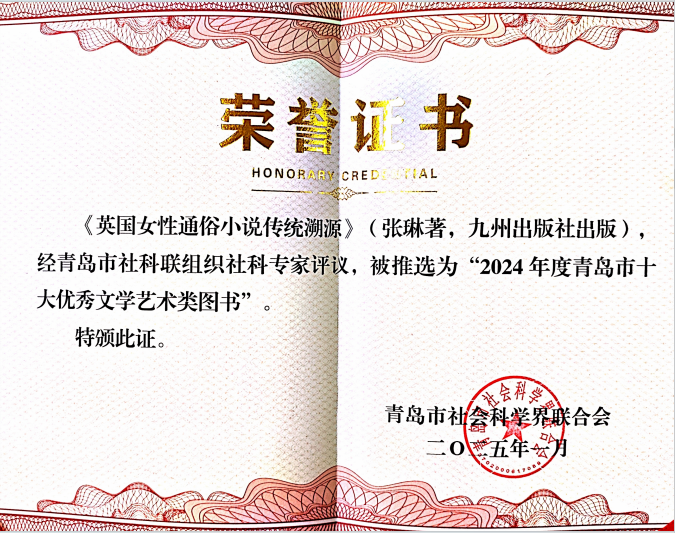 近日,第二届青岛市优秀人文社会科学类图书评选结果揭晓,我校张琳老师的著作《英国女性通俗小说传统溯源》入选“青岛市十大优秀文学艺术类图书”,董栋、李冬梅、邱艳春老师的三部专著(译著)入选“青岛市优秀人文社科图书”。同时,我校获评优秀组织奖。