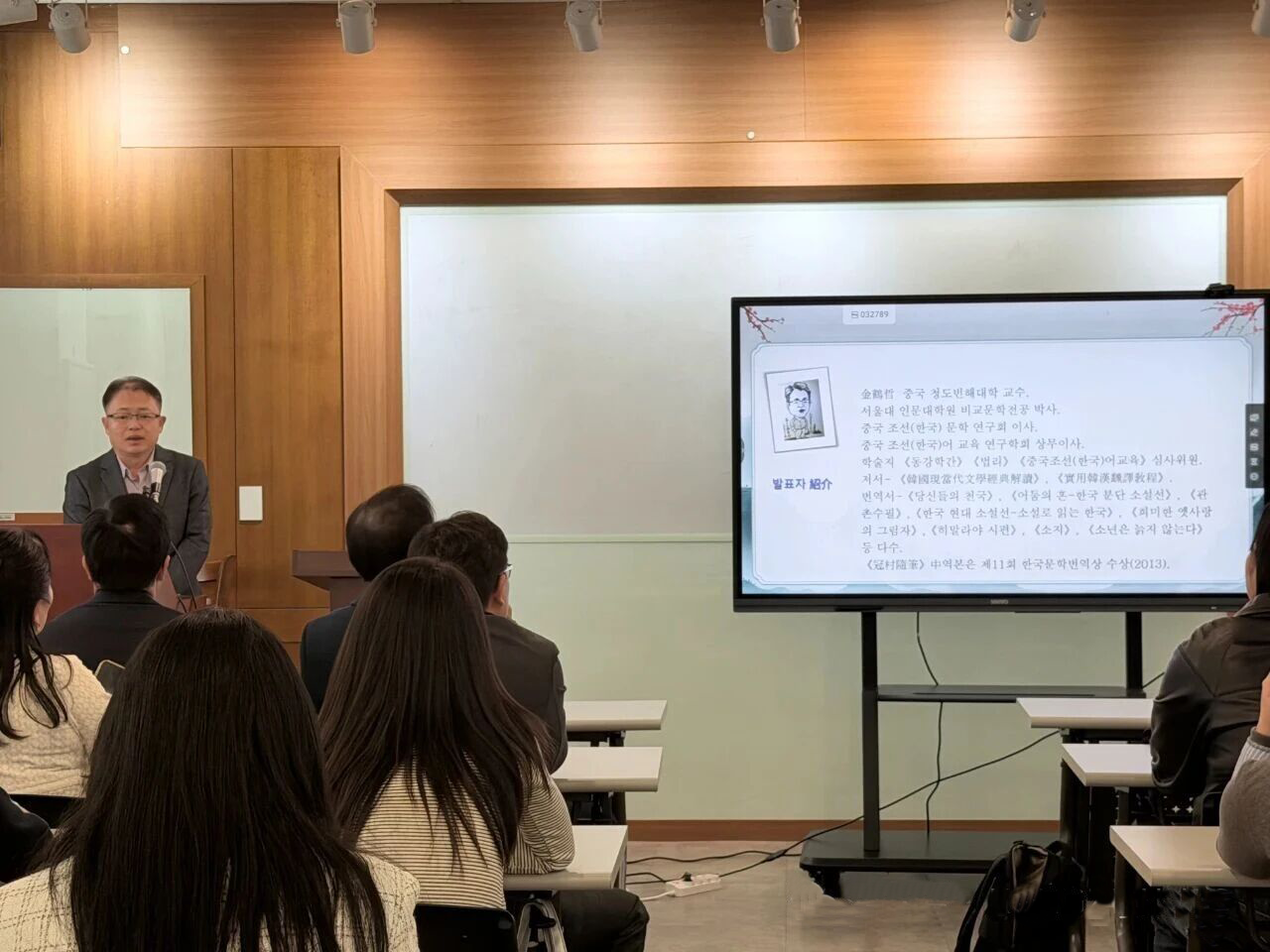 金鹤哲以《中韩诗学中的悲鸟杜鹃比较研究》为题作专题学术报告。他在报告中指出,中韩古典诗话中的杜鹃鸟呈现出不同形态,却蕴含相似文化意蕴;朝鲜半岛在接纳中国杜鹃鸟文化内涵的基础上,进一步完成了该意象的本土化意义建构。在研讨会的致辞环节,金鹤哲表示,中国学研究的生命力在于跨文化对话与多维度创新,而中韩作为地缘相近、文化渊源深厚的邻国,在文学、民俗、语言等领域的比较研究,既是推动中国学拓展的重要路径,也是促进中国文化对外传播的有效载体。