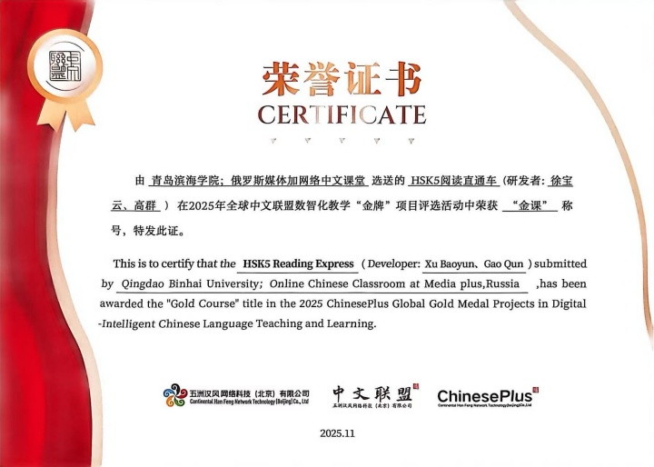 11月14日-16日,由中国教育部主办,教育部中外语言交流合作中心、中国国际中文教育基金会、世界汉语教学学会共同承办的2025世界中文大会在北京举行。来自全球160多个国家和地区的教育主管部门、中外高校负责人、驻华使节等近2000人参与。由青岛滨海学院与俄罗斯媒体加网络中文课堂共同培育的《HSK5阅读直通车》课程在2025全球中文联盟数智化教学“金牌”项目评选活动中荣获“金课”奖项。