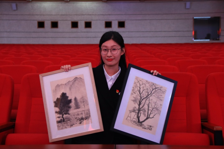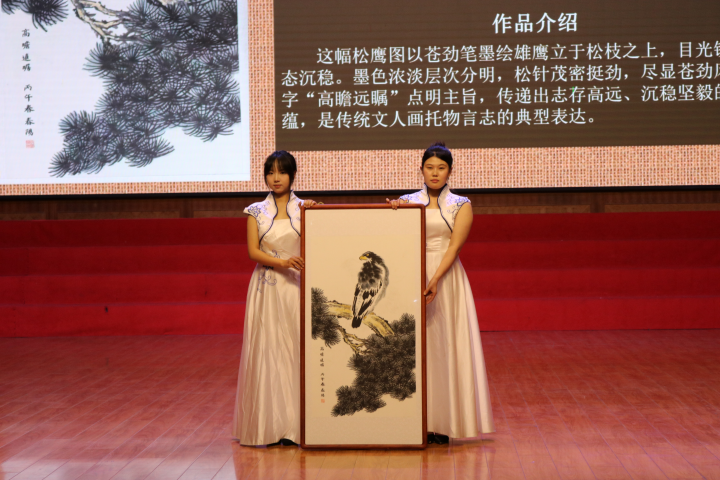 当晚,2025级护理学专业学生徐焕瑶携其水墨画作《枯枝承霜》《青衿拾级》亮相,成为全场关注的焦点。谈及创作初衷,徐焕瑶动情地说,这两幅作品的灵感源自她备考期间的艰难时光。画中奋力生长的枯枝,正是她在焦虑与迷茫中依然坚守的初心,“青衿”喻指学子,“拾级”象征攀登,她希望通过画作告诉身边同学:那些看似难熬的时刻,终将成为成长的铺垫。